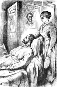 Alcott’s time as a nurse in the hospital began at about the time the Army of the Potomac suffered defeat at the Battle of Fredericksburg, Virginia, at a cost of thousands of casualties. The hospital was soon overwhelmed with wounded soldiers, forcing the novice nurse to quickly learn how to take care of them. The hospital’s patients also included many ill soldiers, as diseases like dysentery and typhoid fever were rampant in both armies, taking more lives than were lost in battle. Alcott herself came down with typhoid fever, ending her term as a nurse after six weeks.