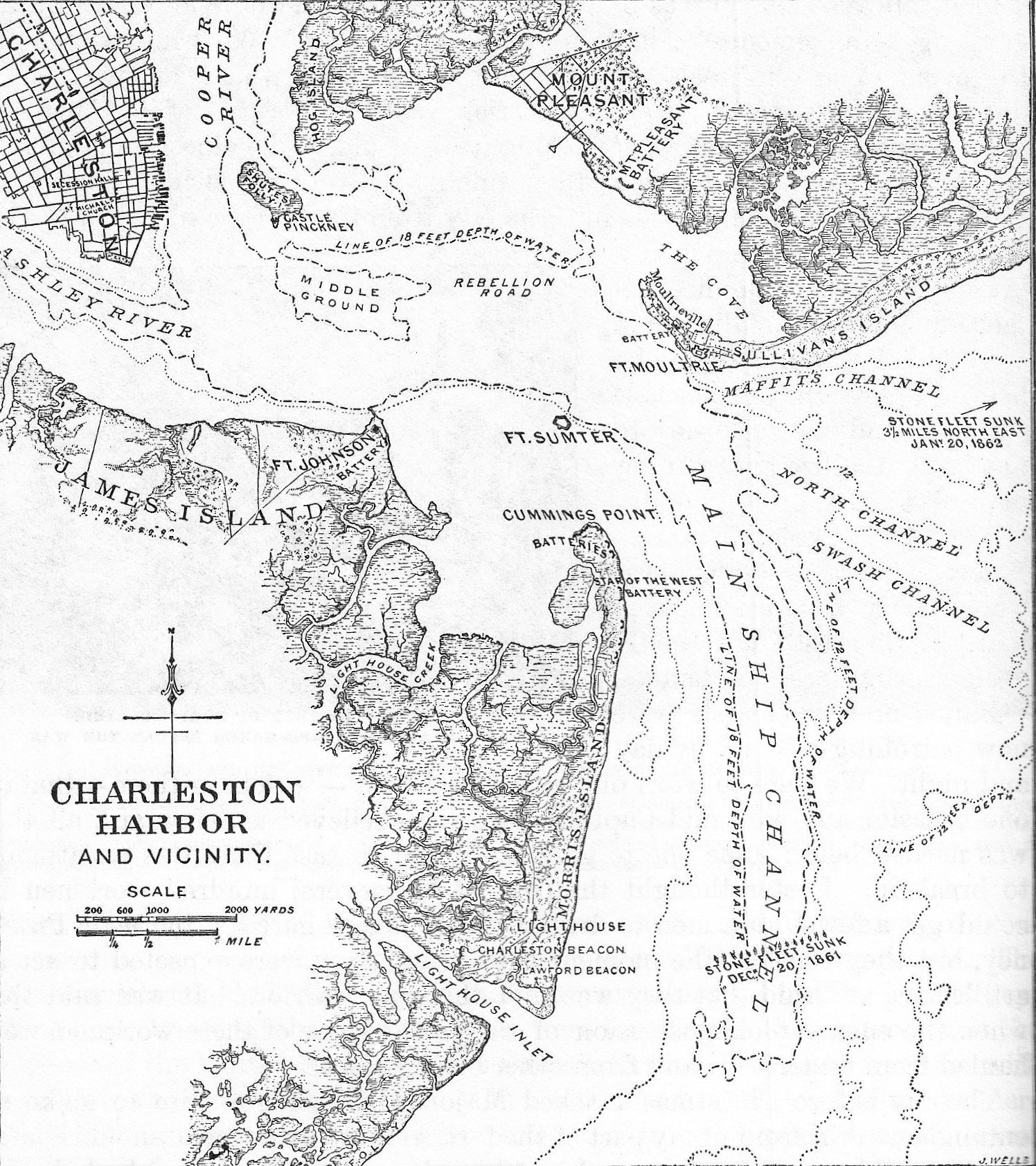 On Tuesday afternoon, 8th instant, arms and ammunition were issued to all the men. About midnight same evening we arrived off Charleston Harbor, and remained groping in the dark until nearly day, when we discovered the light on Fort Sumter, which told us where we were. The other coast light marking the approaches to the harbor had been extinguished, and the outer buoy marking the channel across the bar gone. During the night we saw what we supposed to be the light of a steamer cruising off the harbor, but she did not discover us, as our lights were all out. Just before day we discovered a steamer lying off the main ship channel. As soon as they made us out they burned one blue light and two red lights, and, receiving no response from us, immediately steamed up the channel. As soon as we had light enough we crossed the bar, and steamed up the main ship channel. This was on the first of the ebb tide, the steamer ahead of us firing rockets and burning lights as she went up. We proceeded without interruption until we arrived within one and three-quarter miles of Forts Sumter and Moultrie—they being apparently equidistant—when we were opened on by a masked battery near the north end of Morris Island. This battery was about five eighths of a mile distant from us, and we were keeping as near into it as we could, to avoid the fire of Fort Moultrie. Before we were fired upon we had discovered a red palmetto flag flying, but could see nothing to indicate that there was a battery there.