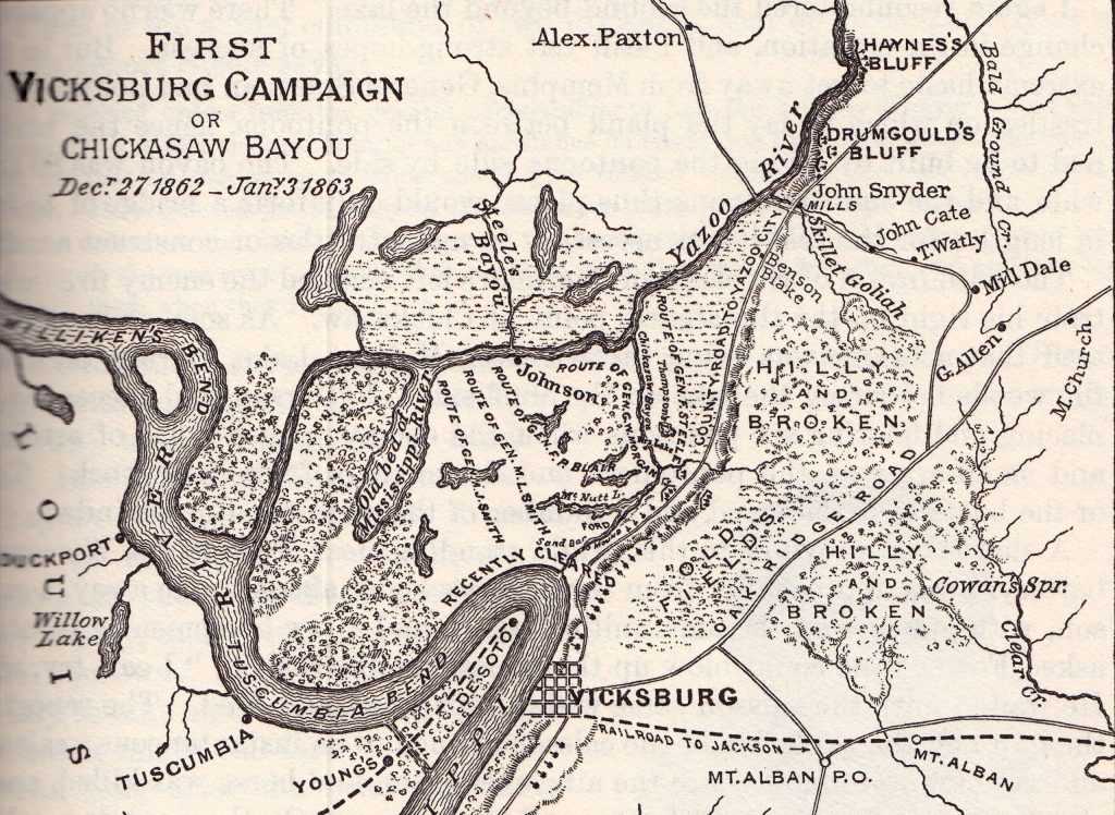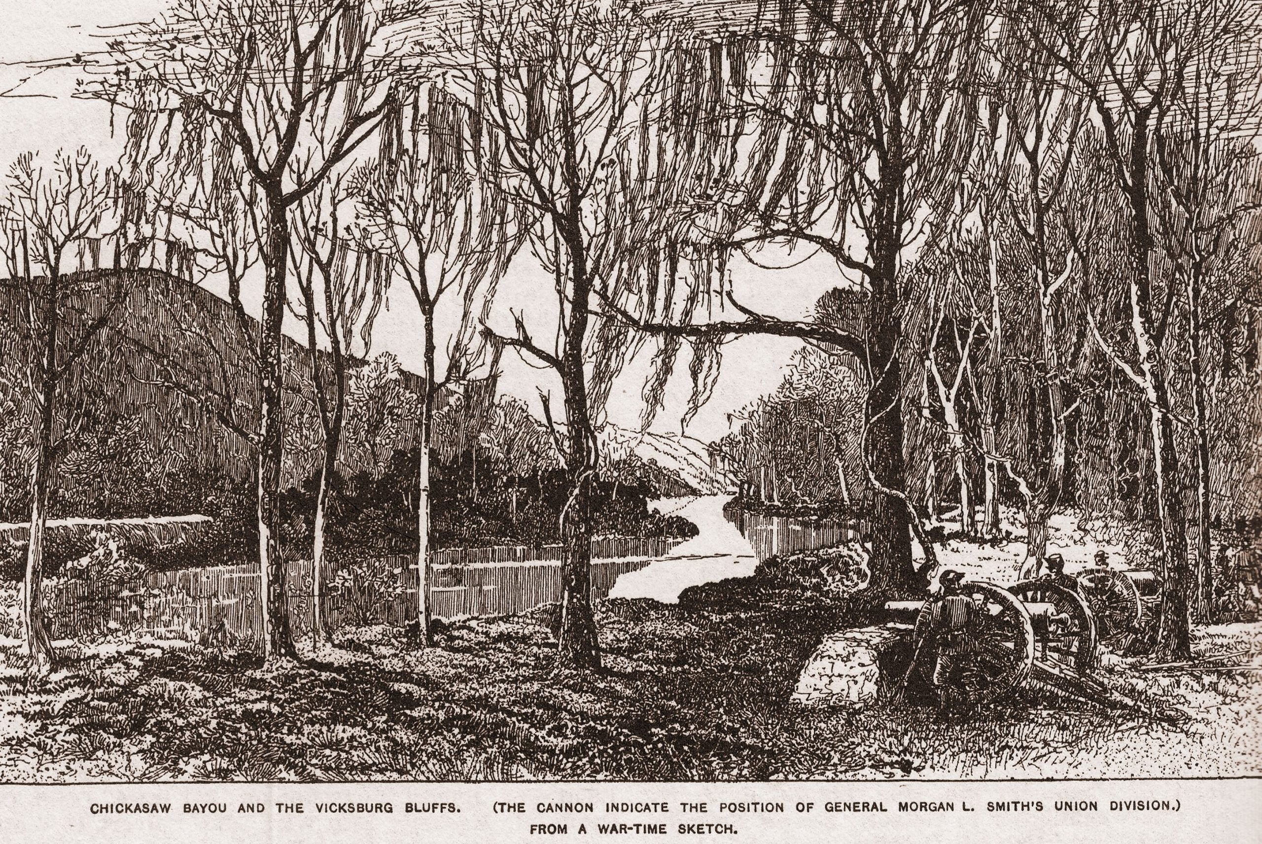Before he successfully captured Vicksburg, Mississippi in July 1863, Major General Ulysses S. Grant had made some attempts to capture that vital Mississippi River city that ended in failure. One of these was a December 1862 two pronged attack. Grant led one force that moved south from Tennessee through northern Mississippi, setting up supply bases along the way and using the Mississippi Central Railroad as his supply line. Major General William T. Sherman led a four division command down the Mississippi River to Chickasaw Bayou on the northern side of Vicksburg. Grant assumed—or hoped—the Confederates defending the city would be drawn out into battle with his army, leaving Vicksburg lightly defended for Sherman.